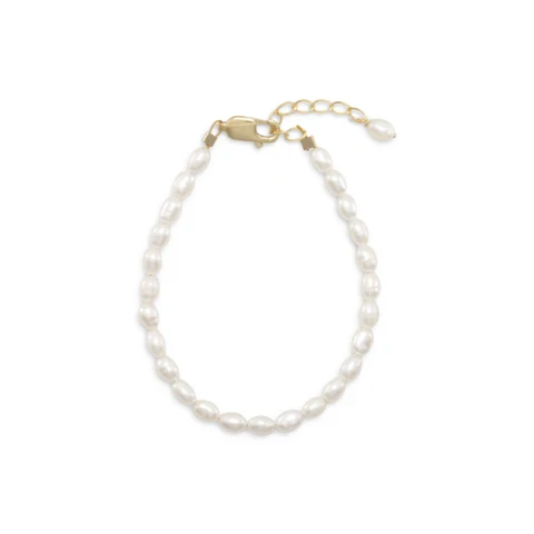 5" + 1" extension 14/20 gold filled cultured freshwater rice pearl bracelet with approximately 3.5mm x 5mm white rice pearls. This bracelet has a lobster clasp closure.